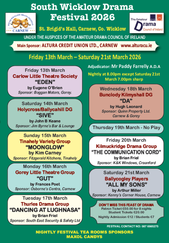 The 2026 South Wicklow Drama Festival will take place in St. Brigid’s Hall, Carnew from Friday 13th – Saturday 21st March (excl. Thur 19th March).